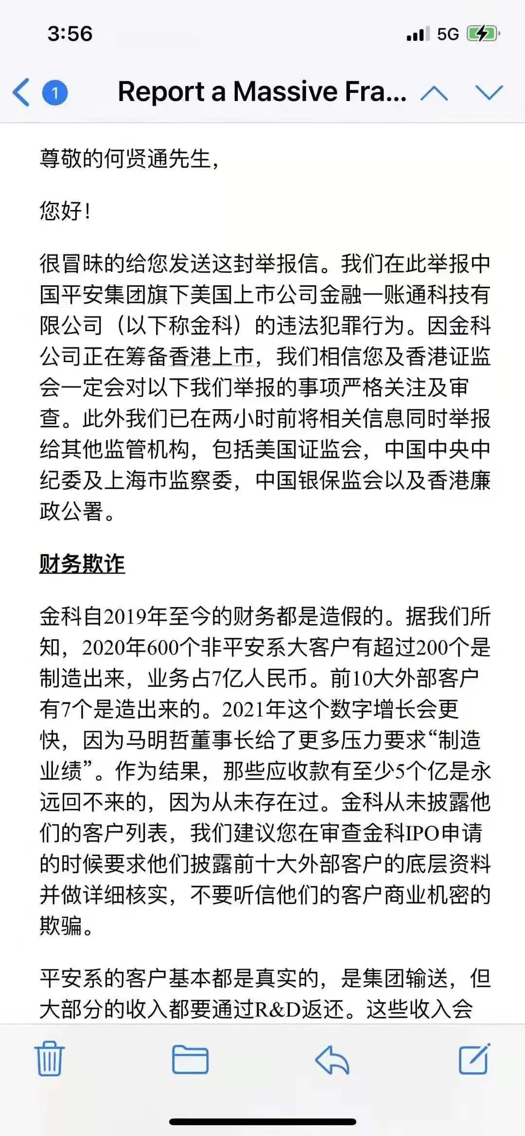 昨天市场上流传一份举报信称,中国平安旗下金融壹账通存在财务欺诈、商业贿赂、欺骗监管等行为。
