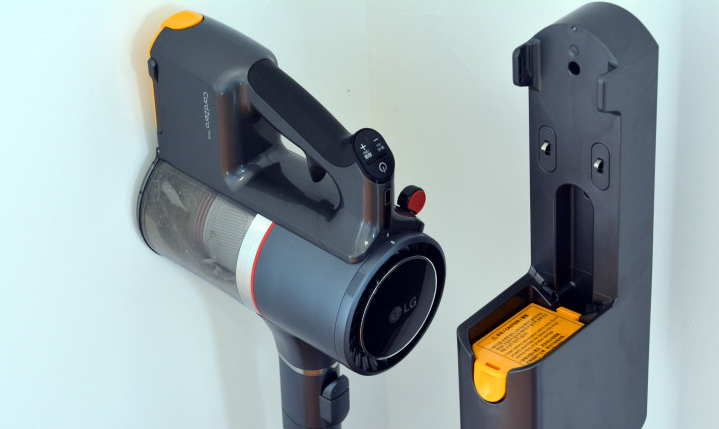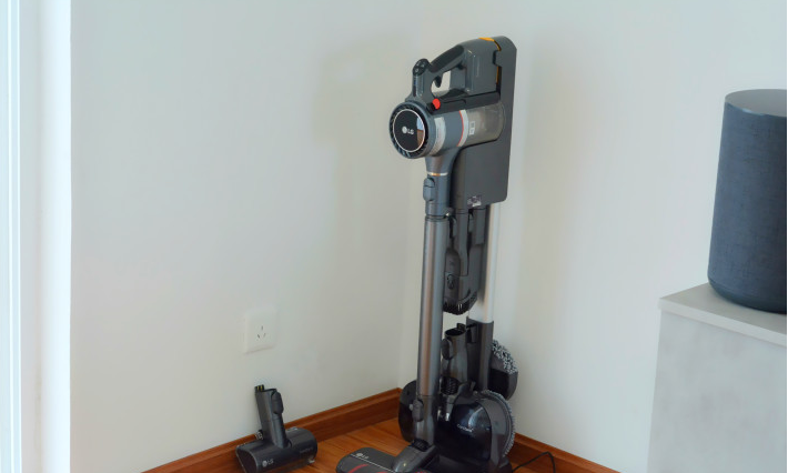 LG A9K Max还有一个立式收纳架。不用的时候,可以把吸尘器和各种吸头配件存放在一起。放置在客厅的角落不会占用太多空间,吸尘器在存放的同时可以自动充电。