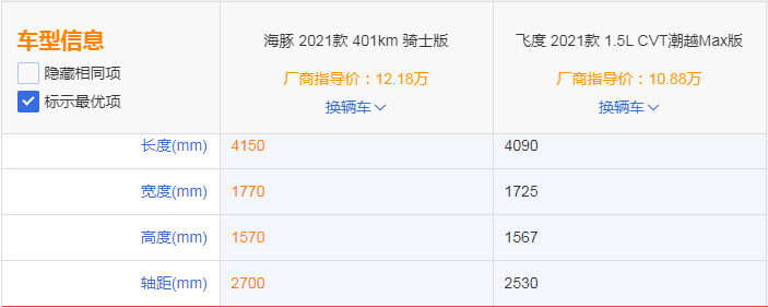 比亚迪海豚的车身尺寸长宽高分别达到了4150mm、1770mm、1570mm,而轴距为2700mm,轴长比达66.3%,车内乘员的肩、臀、肘部空间,以及后排乘员腿部空间均达到B级车标准。这样的空间可能单说缺乏对比,我们拿飞度来比较一下,从上图的参数对比来看,比亚迪海豚在尺寸上可以说完胜飞度。