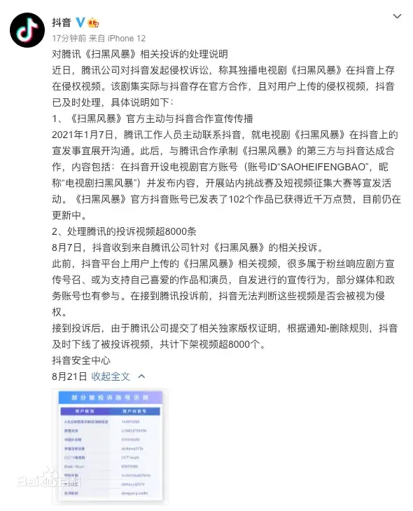 此前,腾讯对抖音发起侵权诉讼,称其独播电视剧《扫黑风暴》在抖音上存在侵权视频,而该剧集实际与抖音存在官方合作,只是用户并没有版权二创,对此抖音已及时处理。该事件就曾引发诸多网友不满,认为某方有“卸磨杀驴”之嫌。