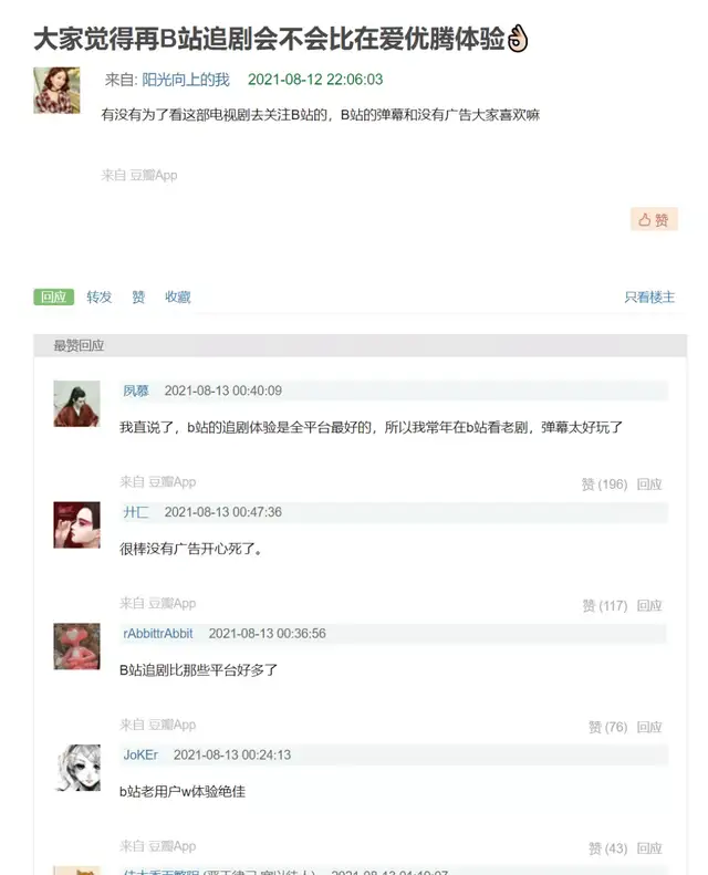 如今,观众对爱腾优芒的超前点播各有异见。多场舆论战后,B站凭借无广告顺滑观看模式兵不血刃“躺赢”。