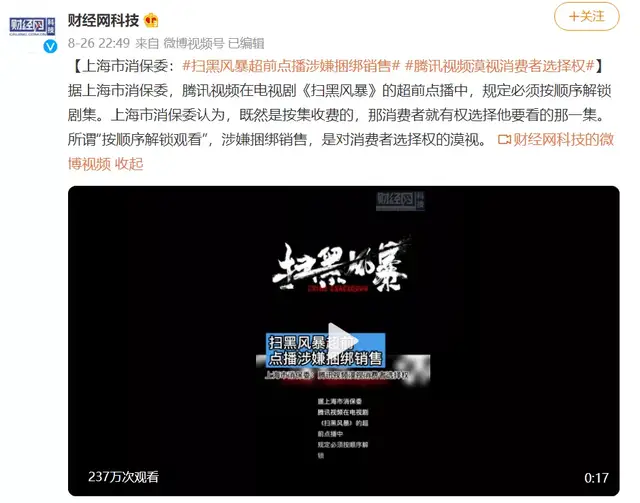 8月26日,上海市消保委官方微信号发文称,腾讯视频在电视剧《扫黑风暴》的超前点播中,规定必须按顺序解锁剧集。上海市消保委认为,既然是按集收费的,那消费者就有权选择他要看的那一集。所谓“按顺序解锁观看”,涉嫌捆绑销售,是对消费者选择权的漠视。诸多网友更是表示,“超前点播”本身就是“套路贷”。