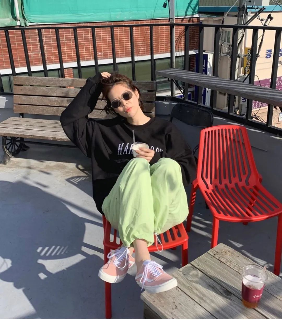 如果觉得全绿太张扬,那可以搭一件黑色上衣,看起来是不是很奶思~