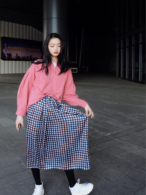 换种方式,蓝白格纹的V领收腰连衣裙,也可以穿出邻家小姐姐的亲切感。