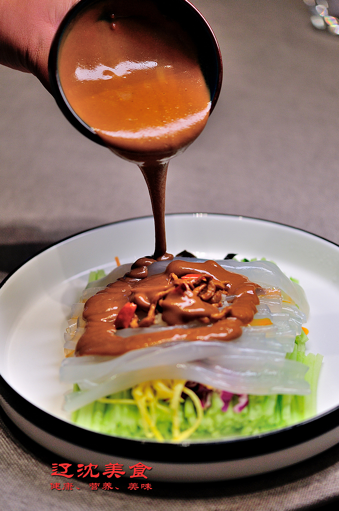 搭配这道菜有一碗麻酱,它是五彩拉皮的灵魂调料,加入白糖、腐乳等调味品的麻酱是每一个厨师的独家秘方,这道凉菜看似简单,但是调味不容易。酒席上每一桌都会有人拿着公用筷子负责调理这道菜,大家叫他拌菜小能手,风靡东北的蘸酱菜不一定能端上饭桌,而这道菜可以登上大雅之堂,光明正大走向东北的各种宴席。