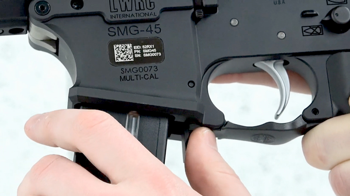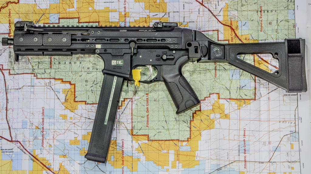 这杆枪的名字叫SMG 45,名字就可以很好地看出来了,这款枪就是一个发射.45ACP的冲锋枪,Submachine gun .45。而至于说这款枪是手枪呢,这就是美国法律上的问题了,枪管短于十英寸、没有枪托、没有前握把,统一都叫手枪。而这把枪原本,其实就是一杆冲锋枪,但是现在冲锋枪基本都凉了,LWRC就把目光投向了民用市场,主要生产的就是手枪型。
