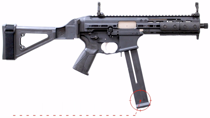 SMG45采用了8.5英寸的枪管,比那一票PDW要长多了。而且采用了一个SB Tactical战术臂箍,也可以叫手枪稳定支架。这东西主要就是规避美国法律用的,这个不算是枪托,所以名义上它还是没有枪托的,但是名字上他却叫冲锋枪。这就是为什么,这杆叫.45冲锋枪的枪却是手枪的原因了。