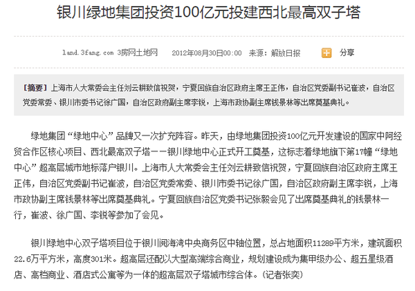 2012年年中,绿地集团拍得位于银川阅海湾中央商务区中心位置,总占地面积11289平方米的黄金地块,计划投资100亿开发建设中阿经贸合作区核心项目、当时西北最高双子塔——银川绿地中心。项目建筑面积22.6万平方米,高度301米。
