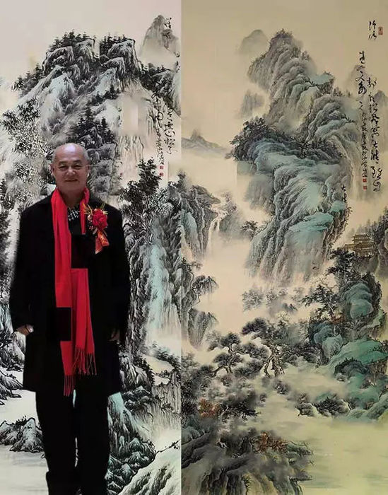 其画作幽静、闲逸、禅境让每一处落于生宣上的墨块保留着最自然的韵味灵性。他把自己的善行、善念、善心融合笔墨笔触之线条与勾线之中,妙笔生花,使画面有了灵魂、生命力和感染力。犹如宋、元、明、清的清逸悠远的音乐,播洒着空灵的音响,令我们荡气回肠,千百回而不厌倦;而山水画的作品犹如走进梦幻般的神山秀水中。在他的笔下,画树有情,画泉有声,画山有型,云涌群峰溪谷秀,描绘的是中国山川境象,万壑松风,百滩流水,远山望去,重峦叠嶂,云雾缭绕,近处溪水潺潺,松柏长青,山脚树从中隐隐约约的房屋与人物,天地融合一气,展现了中国山川特有的自然、人文景观,给人以生机向上、和谐恬静的意境,画面中,他以淡墨渲染瀑布云,飞流直下,气势壮观,以点染加罩染的碧绿溪水,清澈透明,而恰到好处的留白和云气流水产生的动感,使画面韵味禅意十足。