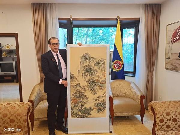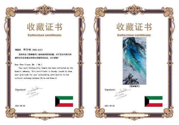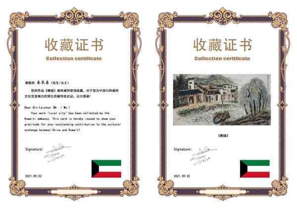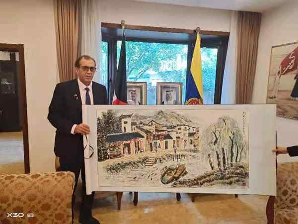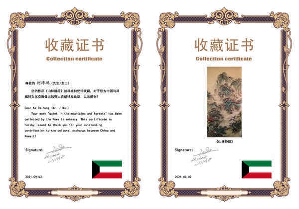2021年9月5日,中华艺术学院柯沛鸿院长山水作品《山林静隐》、秦来春副院长作品《乡城》、陈怡璇副院长作品《灵峰岩寺》及王丽蓉副院长作品《一路荣华》被科威特驻华大使馆收藏展示。
