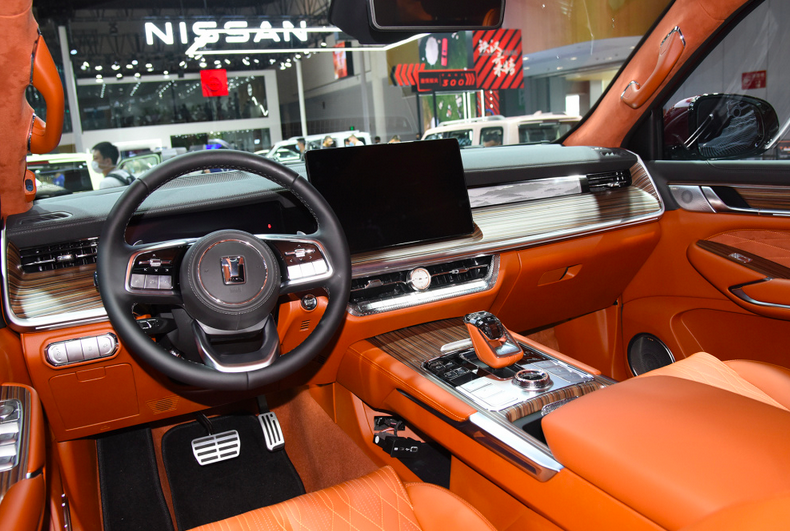 内饰方面,坦克500双色版相比普通版车型在部分细节上进行了调整,左侧配备了三幅式多功能方向盘,前方12.3英寸全液晶仪表盘和中控14.6英寸悬浮式显示屏,下方是对称式空调出风口和造型精致的电子挡把,科技感还是非常不错的。用料上新车运用了大量的真皮材质和木质饰板,车顶处还运用了翻皮材质,不管是质感还是触摸感都非常舒适。