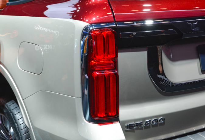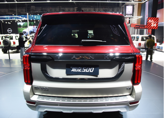 尾部坦克500采用了极为方正的造型,并取消了外挂式备胎,两侧尾灯组采用了竖向布局,并通过中间一条粗壮的镀铬装饰条相连,镀铬装饰条上面还有硕大的"TANK"标识,同时在车牌处还有一条U型装饰条点缀,下方包围处还有银色护板点缀,整体虽然少了一些野性,但多了一些精致感。当然了由于取消了外挂式备胎,它的车身长度也缩减到了4878mm。