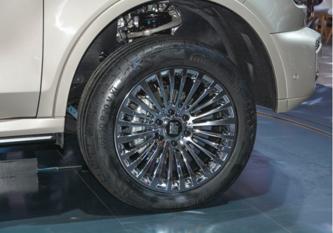 车身侧面坦克500延续了硬朗越野车的造型,饱满而又圆润,加上双色车身的使用让新车看起来非常立体,银色B/C柱以及红色车顶呈现出了悬浮式车顶的视觉效果,前后外扩的轮眉,多辐多越野轮胎以及银色车顶行李架,将豪华感展现的淋漓尽致。车身尺寸上普通版坦克500为5070*1934*1905mm,接近角为26.9度,离去角为24度,最大涉水深度为800mm。