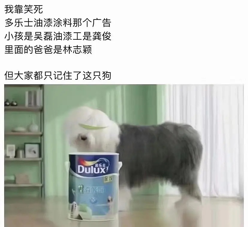 而多乐士拍广告,其实用了不少名人哦!这个油漆的系列广告,有过不少明星拍摄,比如龚俊,在今年龚俊火了之后大家才知道当年多乐士广告里的油漆工就是龚俊,而当年多乐士就找他拍过广告了,偏偏大家对此一点印象都没有,只记得那只狗了。