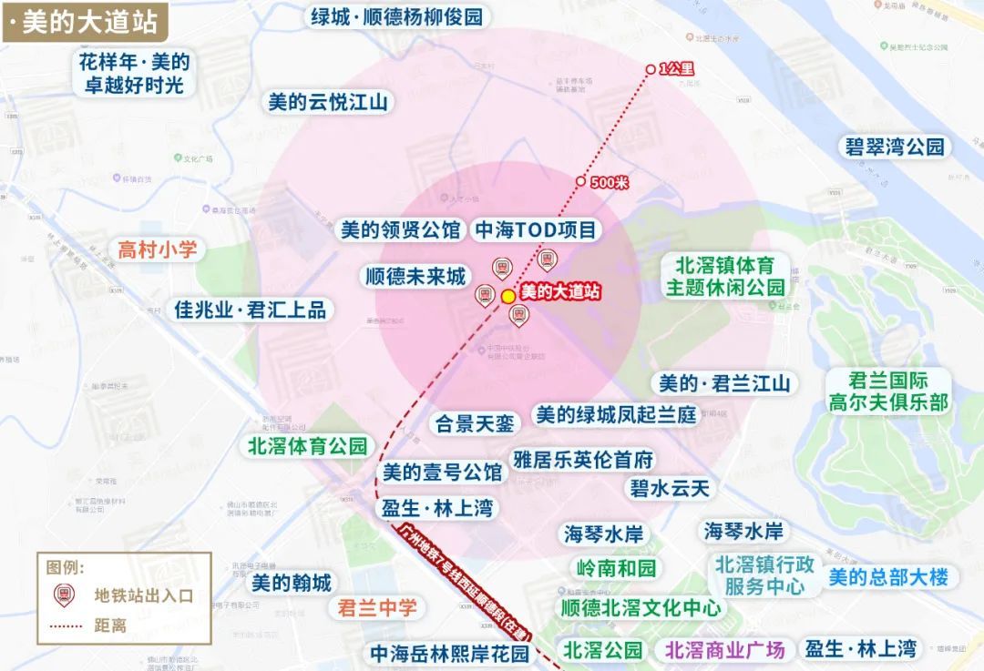 美的大道站是7号线终点站,位于北滘新城北部,目前设置了4个出入口,站点旁有和祐国际医院在建,周边还规划一所九年一贯制学校。