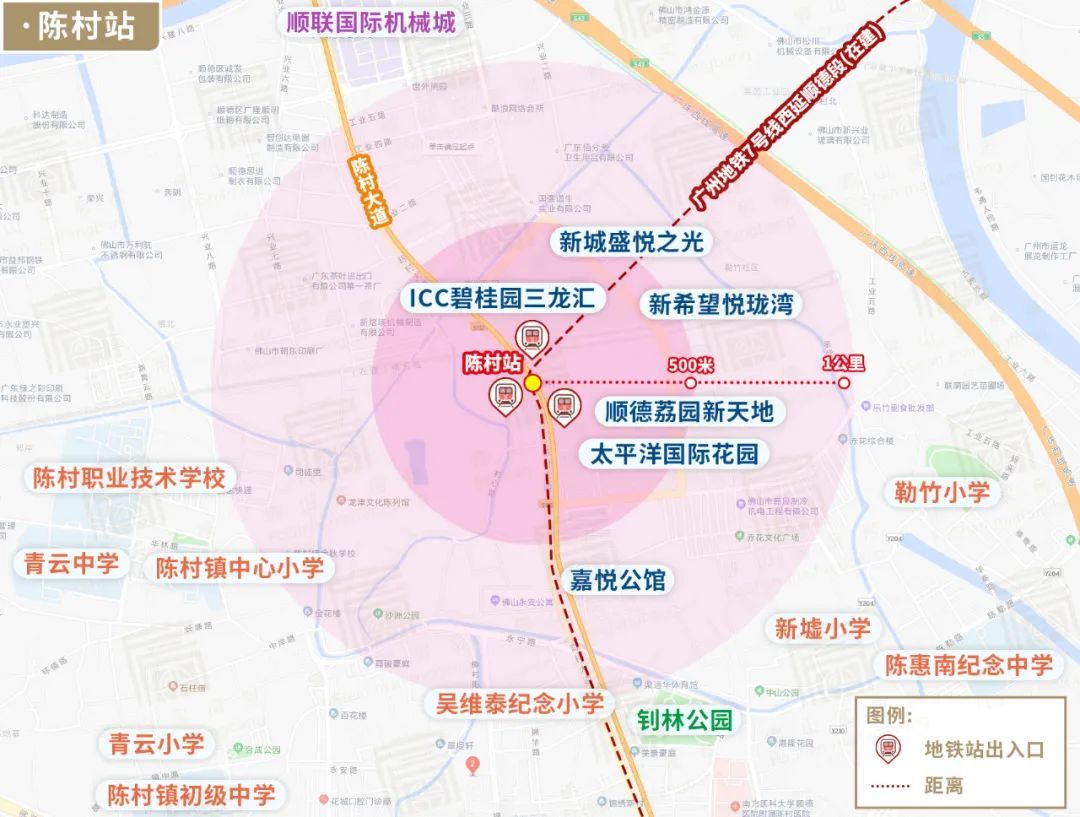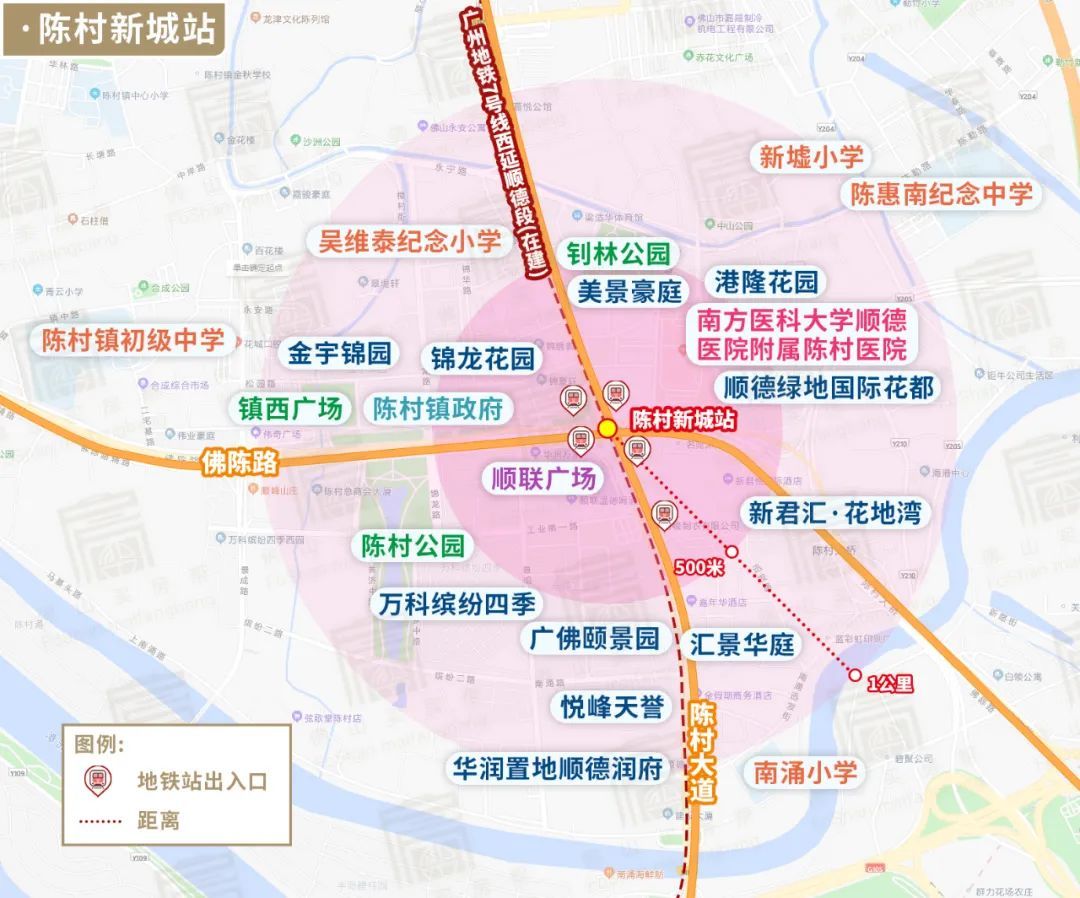陈村新城站位于陈村大道与佛陈路交汇处,共设置5个出入口,周边各项配套齐全,包括顺联广场、陈村公园、陈村镇政府、陈村医院等。