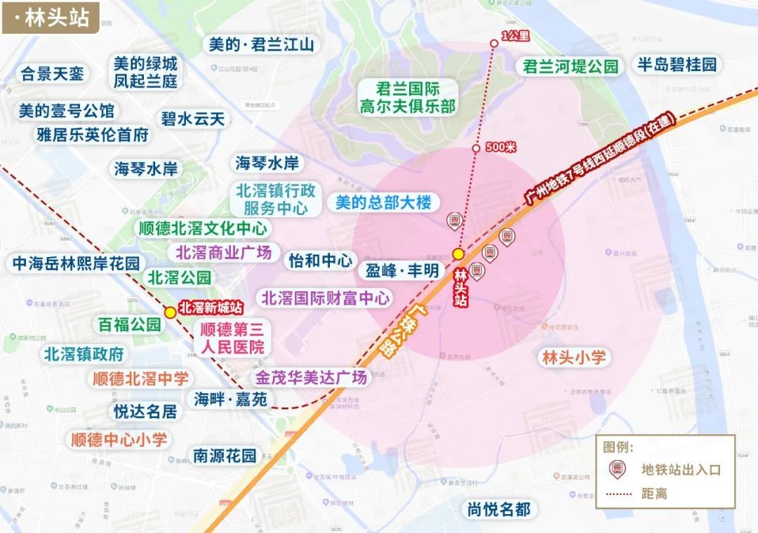 林头站位于北滘新城南侧,设置了4个出入口,周边有君兰国际高尔夫俱乐部、美的总部大楼等。