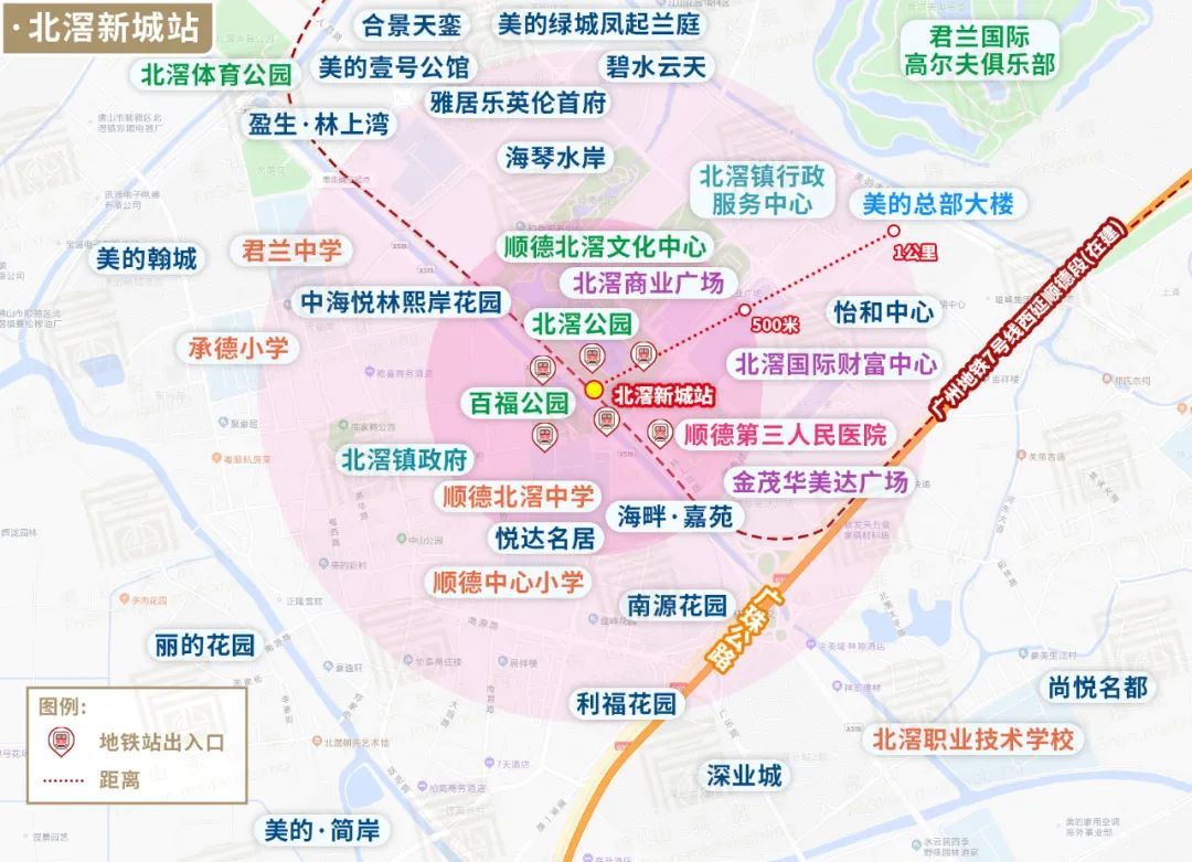 北滘新城站位于北滘公园旁,出入口多达6个,其中一个可连接顺德三院,周边配套丰富,包括北滘商业广场、北滘镇政府,以及北滘中学、北滘中心小学等多所学校。
