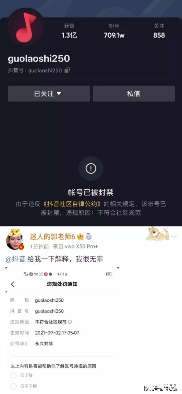 和风小逸不一样的是,风小逸被封后用小号向大家道歉,而郭老师不觉得自己有错,并在微博上@抖音,要求抖音给出解释。但是话音刚落,微博小号又被封了,估计郭老师也要疯了。