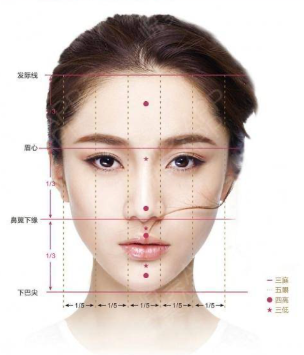 面部美学标准中,将理想的脸宽定义成五个眼睛的长度,将理想的脸长定义成三个等分。
