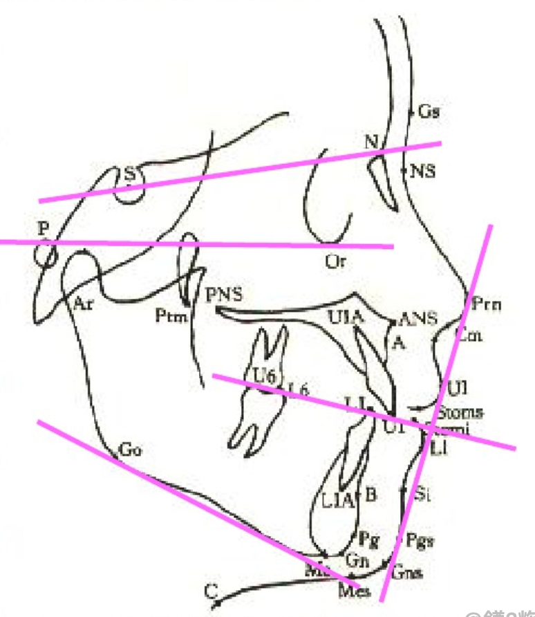 在这张X光片上,医生通过测量面部骨骼,牙齿以及面部软组织的数据,进行侧貌的评估,并以此为依据,制定合适的牙齿矫正方案。
