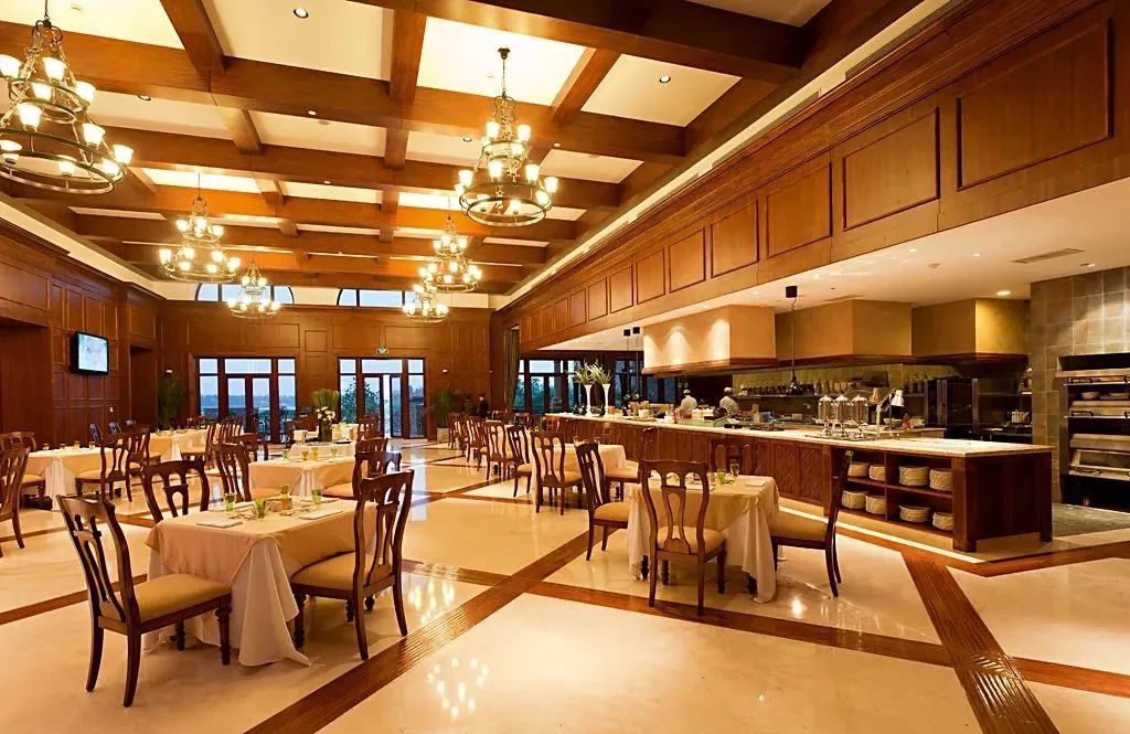 咖啡厅总面积为385平面米,托斯卡纳的装修风格彰显了华贵之风,没有都市的繁杂,低调而沉稳,面对高尔夫球场,视野辽阔,空气清新,全开放式的厨房,客人可全程观摩美食的烹饪过程,主厨会不定期推出特色菜单,让客人切身体会到舌尖上的美味。