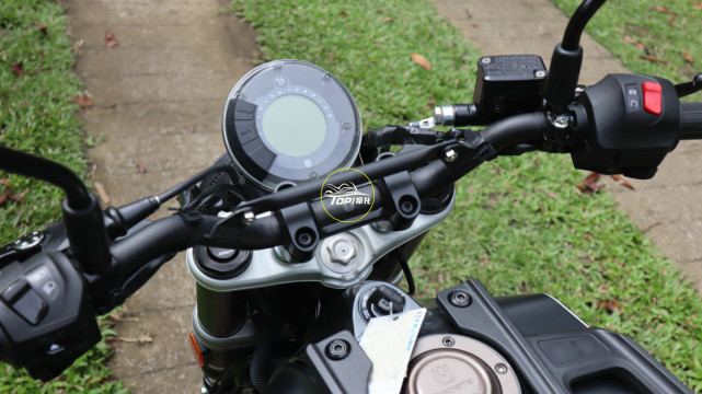 Husqvarna不愧是越野世家,你看车把当中的加强杆就知道,这是越野摩托车上比较常见的配置,搭配在Svartpilen 401上其实并没有觉得很突兀。