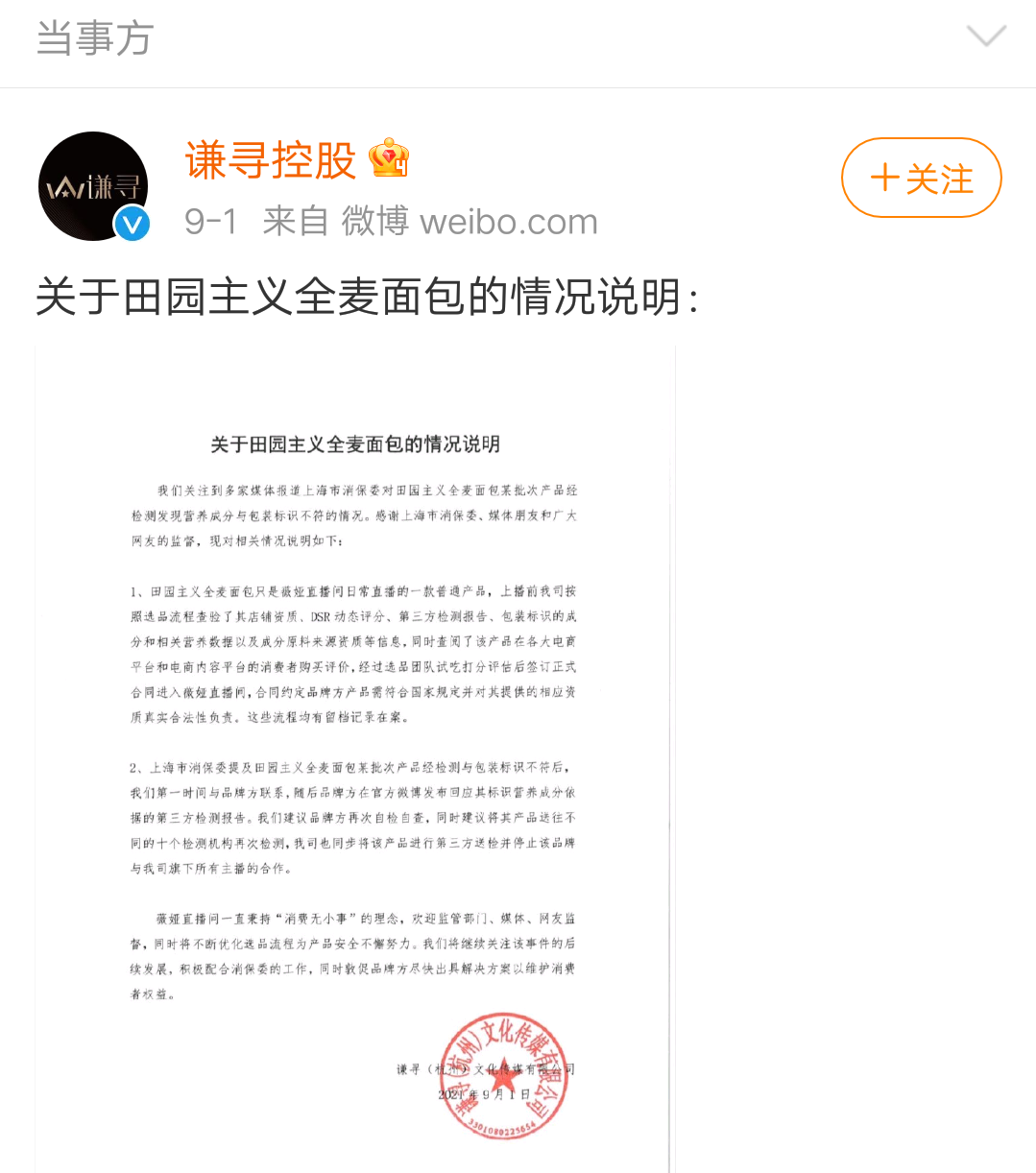 再到9月1日,谦寻控股集团针对旗下主播薇娅近期“带货的低脂全麦欧包低标能量”争议事件在官方微博做出回应,并与田园主义终止合作,当天之后舆论才慢慢降了热度。