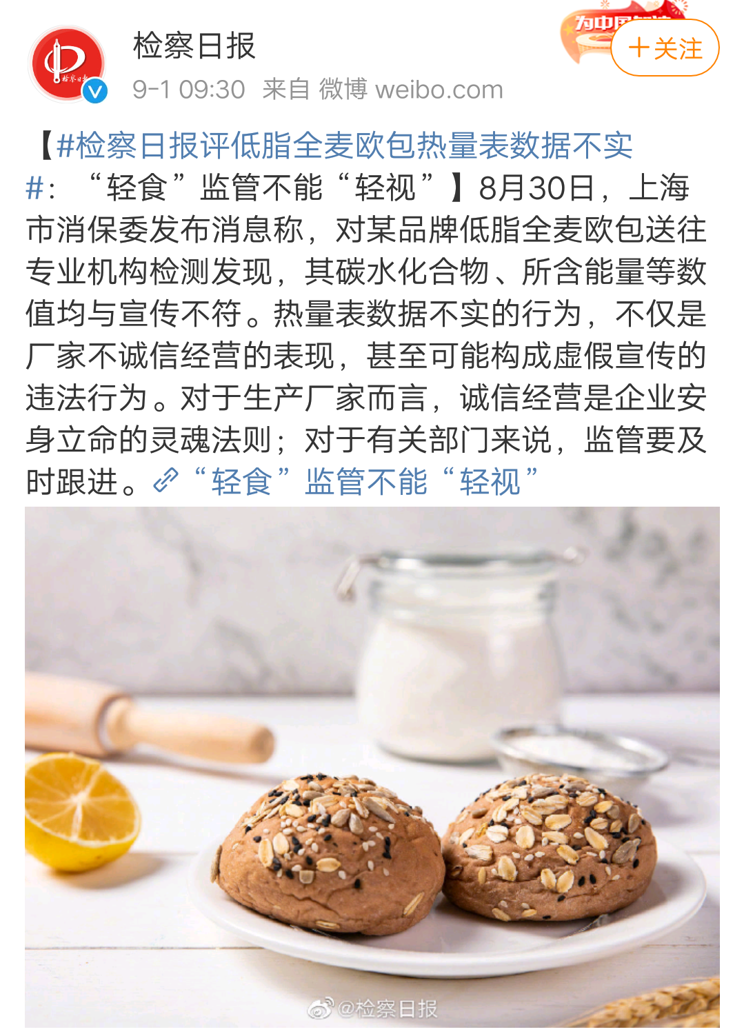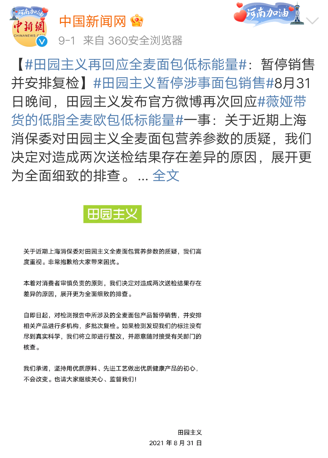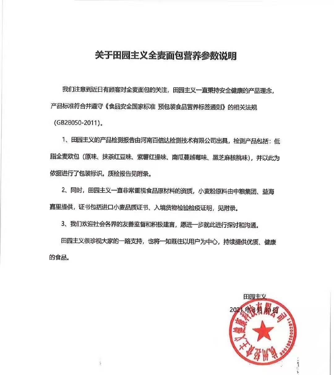 从8月30日,上海市消保委报道对号称全麦面包销售额第一的田园主义低脂全麦欧包送往专业机构检测发现,碳水化合物比标称多出约36%,所含能量比宣传的多出40%。当晚田园主义官微发布声明称,表示自家产品原料没有任何问题,随之引发网友热议;
