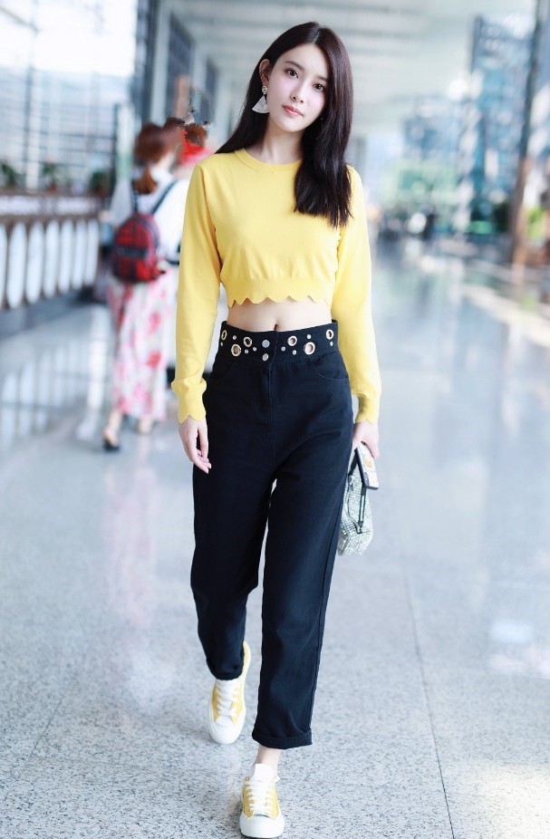 黄色短上衣+镂空高腰裤