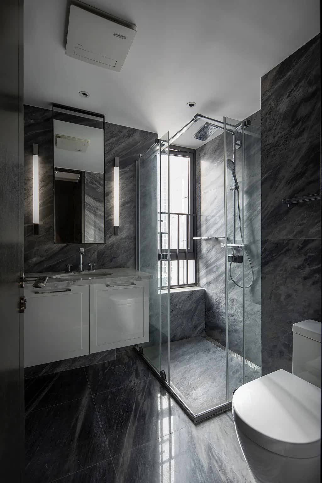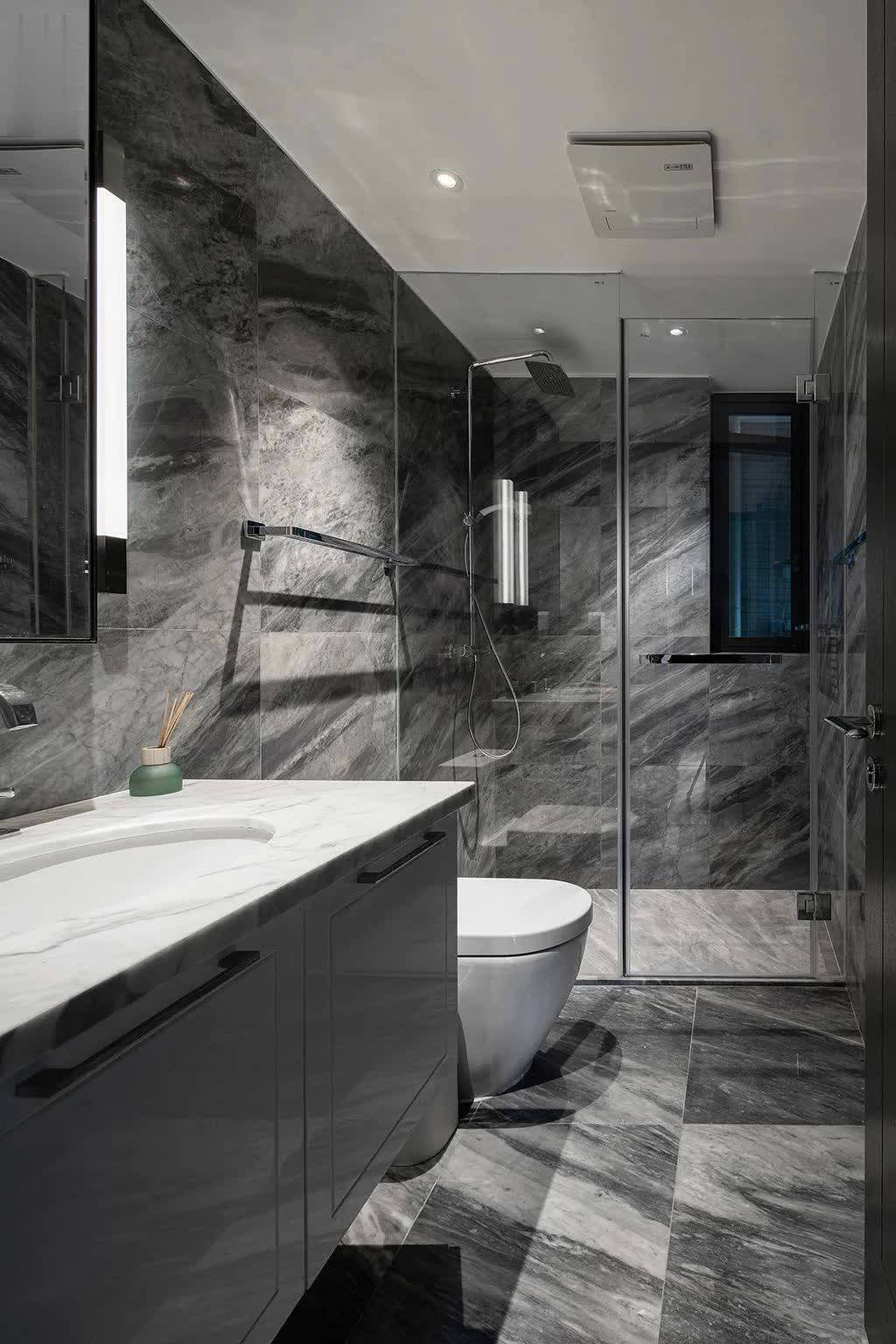 ▲深灰色的卫生间,一字型布置洗手盆、马桶与淋浴房,洗手盆台面是雅白配色,整个空间显得低调高级而干净实用。