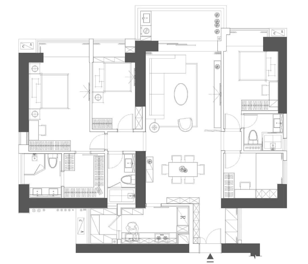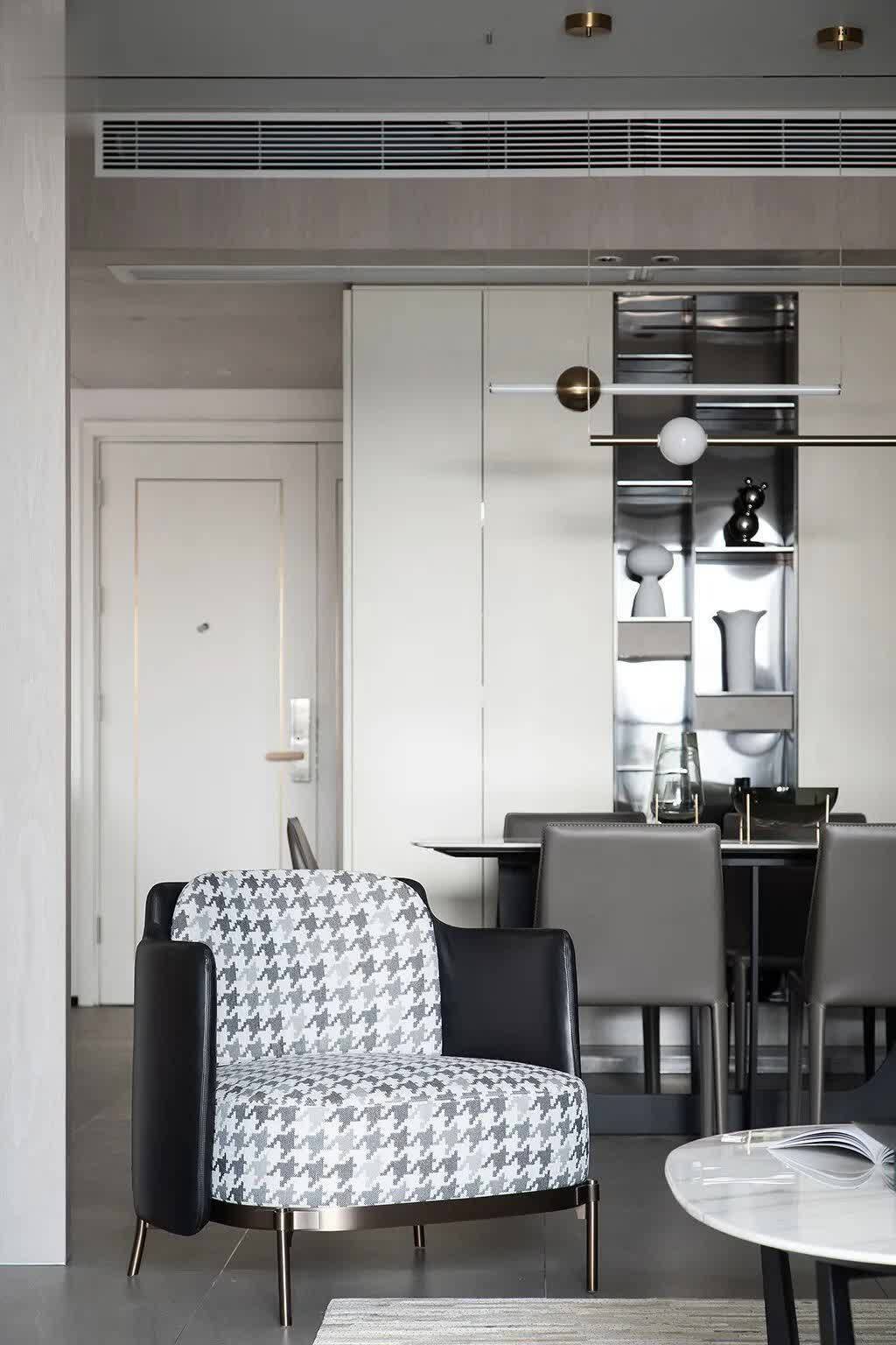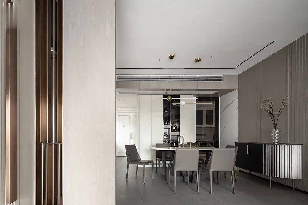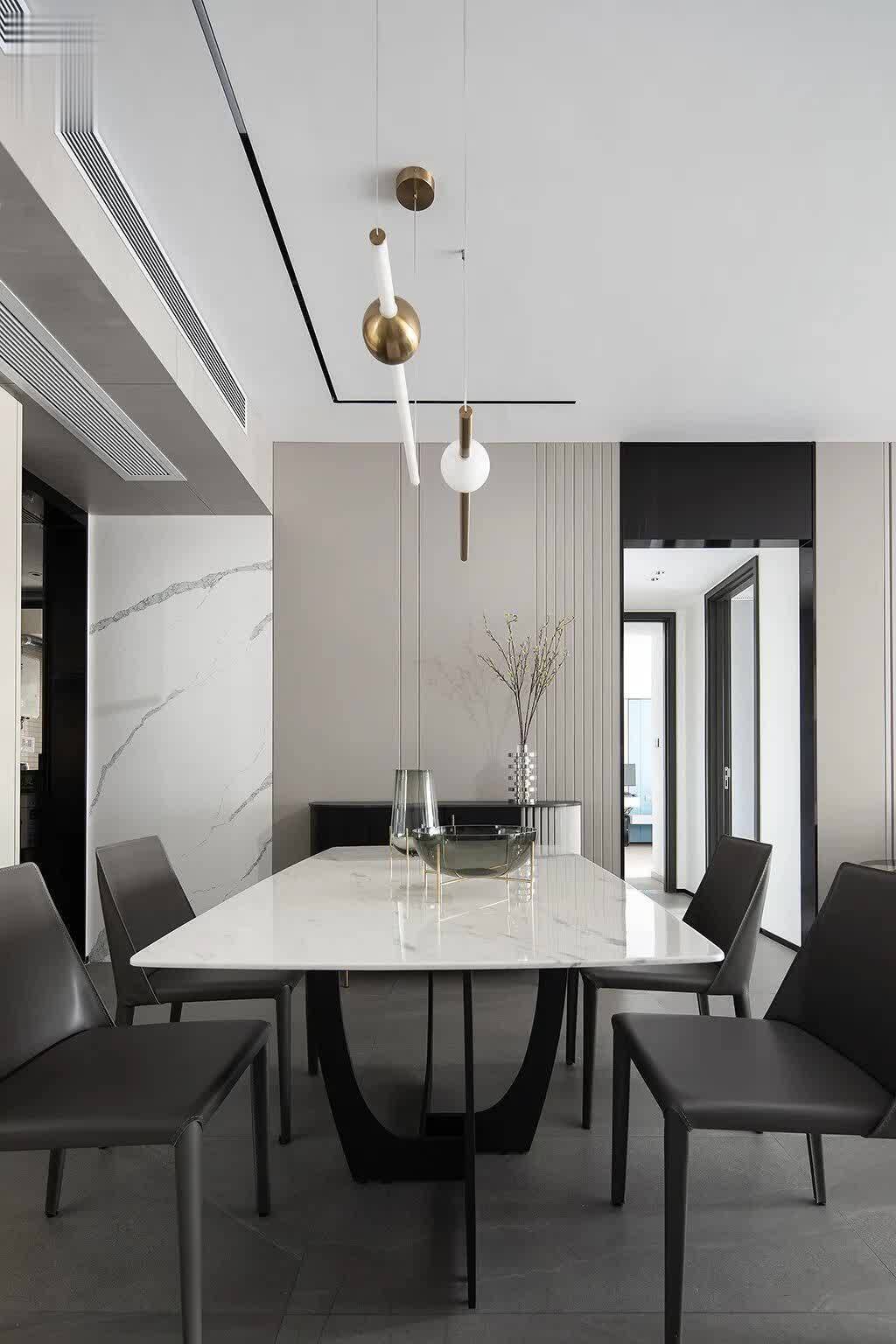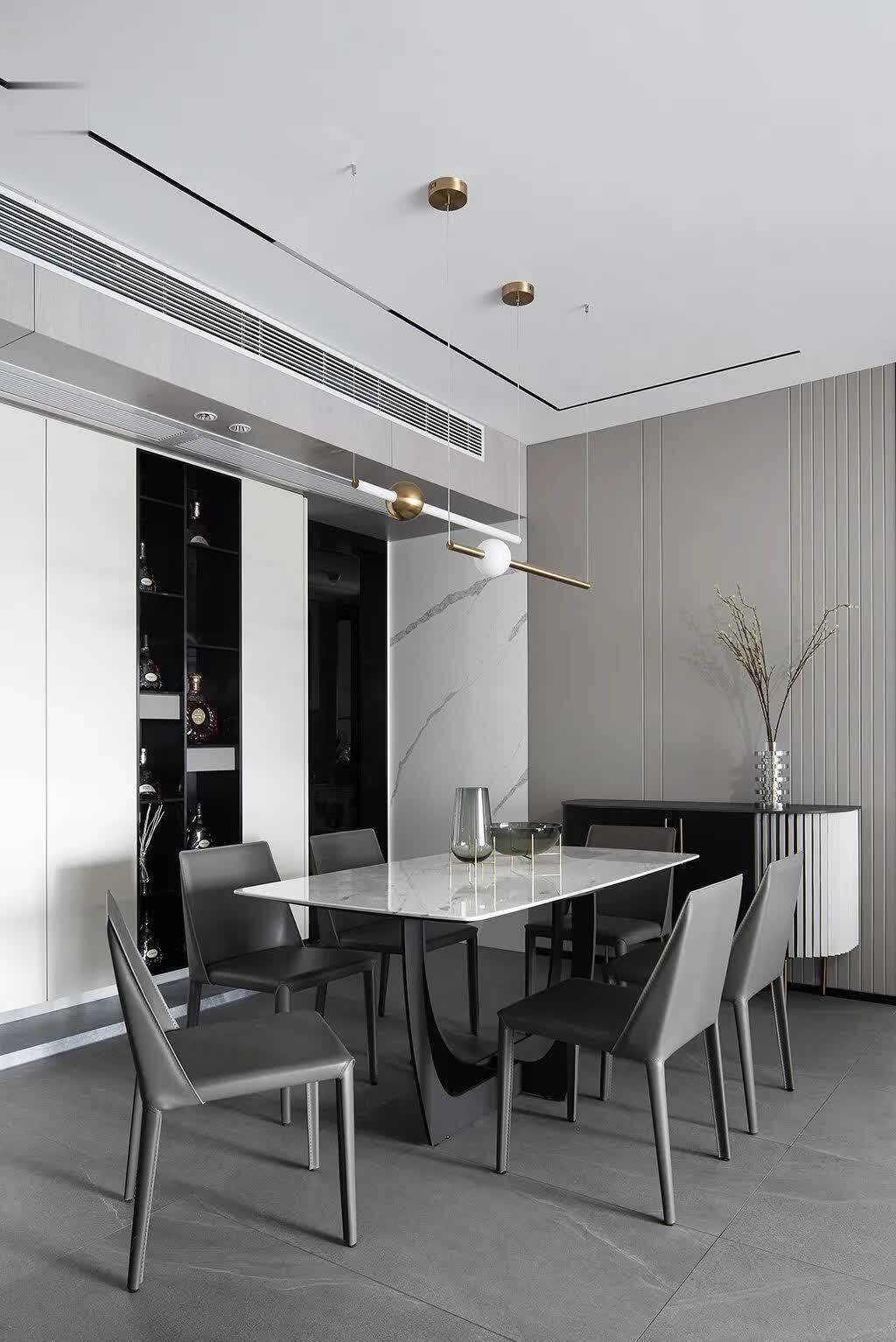 ▲餐厅区域与客厅保持一致的灰色地面,布置灰色皮艺餐椅+雅白台面的岩板餐桌,后方定制黑色餐边柜加入黑色的空格架,而餐厅背景墙则是以大理石+硬包材质组合的设计,布置一个端景斗柜,布置插花,营造出一种现代优雅的用餐氛围感。