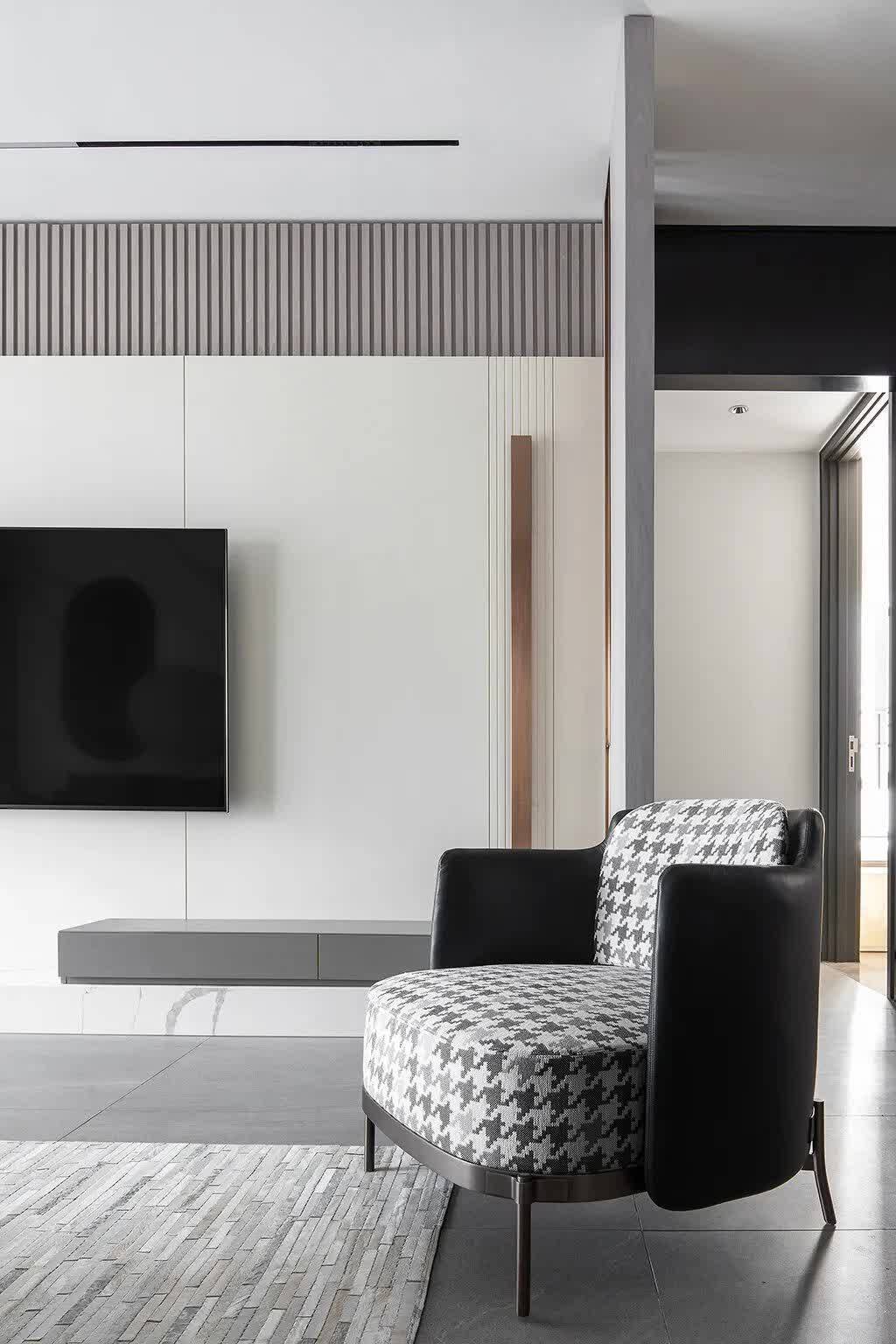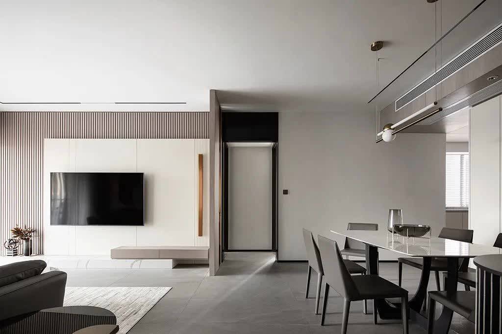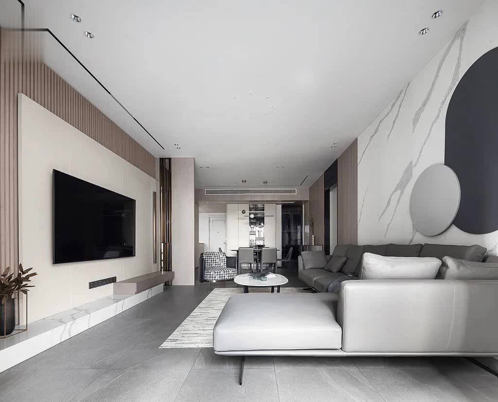 ▲客厅以现代风的空间基调,天花采取无主灯的吊平顶设计,暗藏灯带与筒灯,带来一个简洁舒适的空间气息;地面灰色柔光砖+沙发墙的雅白岩板材质背景、电视墙雅白的地台,布置现代舒适的皮沙发,显得现代优雅而舒适。