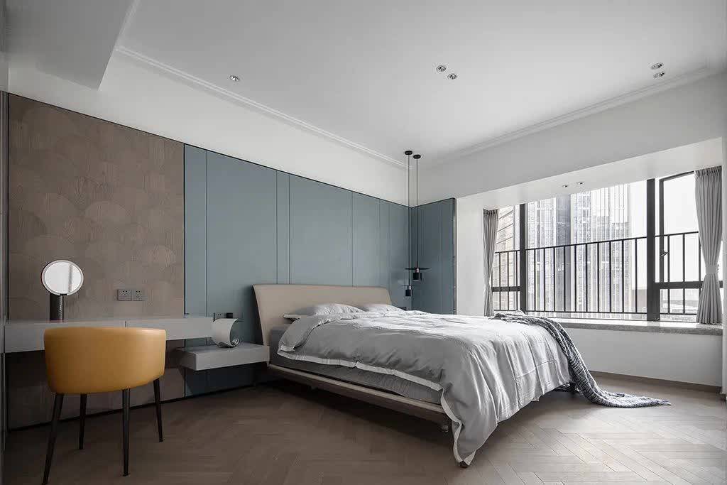▲卧室床头墙整体蓝色硬包的基础,左侧书桌后方的墙面加入扇状纹理的材质装饰,书桌搭配上一张焦糖色的椅子,搭配卡其色的床铺与浅灰色床单,让卧室空间充满安静优雅的质感。