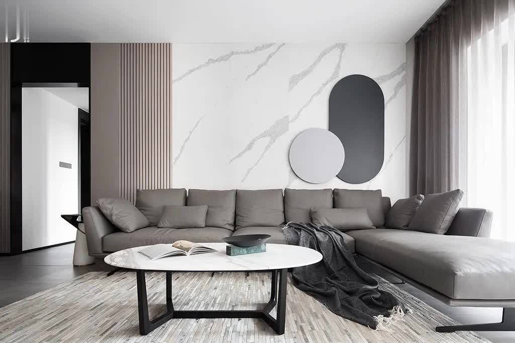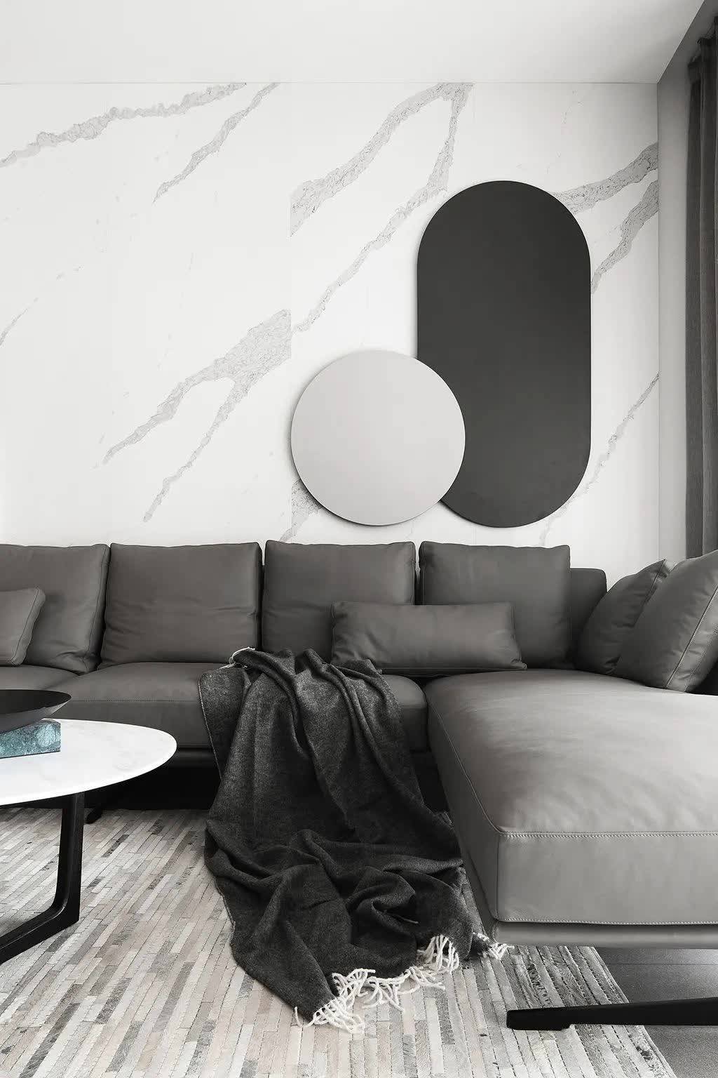 ▲岩板材质的沙发墙,左侧加入长城板、右侧挂上灰色圆形与黑色椭圆形的装饰,搭配灰色皮沙发与灰色布帘,黑白灰的质感,让空间充满现代时尚的舒适体验。
