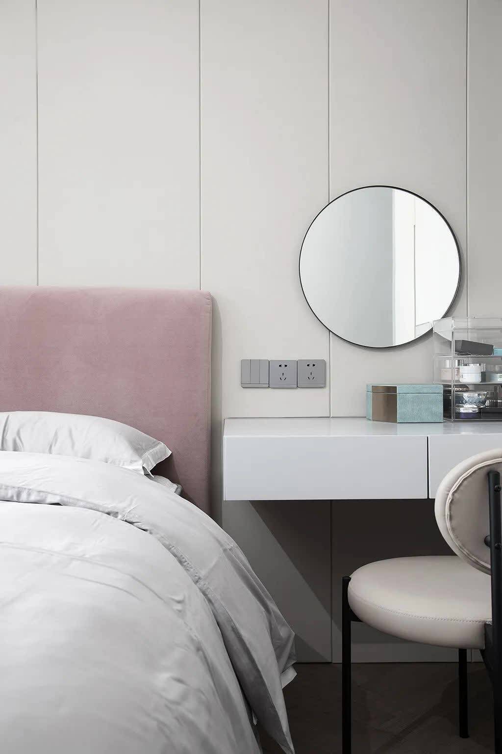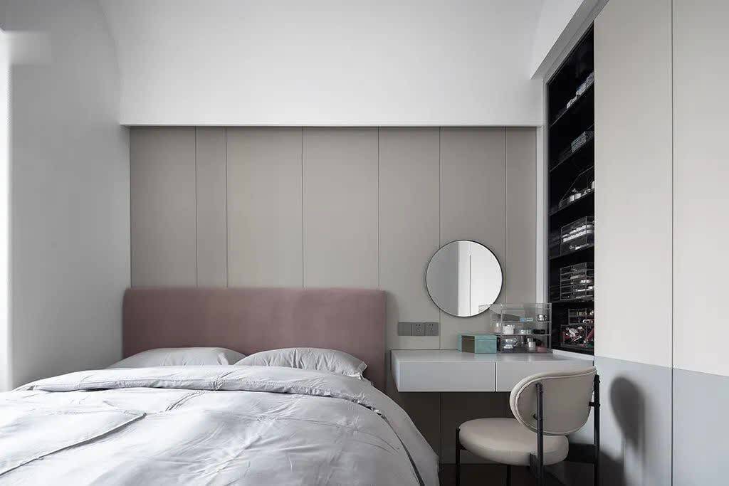 ▲次卧床头墙以灰色硬包,布置褐红色的布艺床+灰色床单,右侧布置梳妆台+圆镜,梳妆台右侧的衣柜加入黑色的开放格,梳妆用品都有了实用方便的摆放位置。