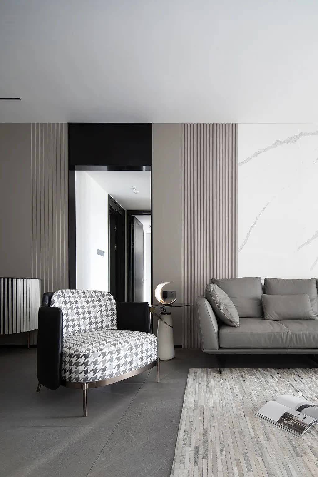 这是一套190平的房子,户型面积较大,整体空间以现代简约风格的空间,大量加入石材、木饰面、硬包的设计,以黑白灰的配色,加入木质感的搭配,布置现代舒适的灰色家具软装,让居住空间充满时尚优雅的大方感。