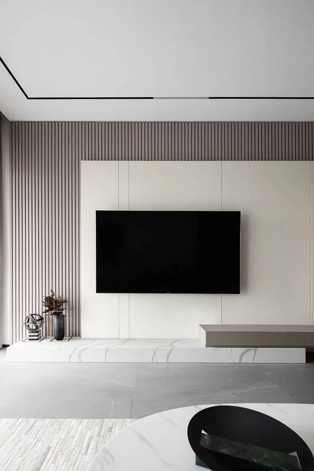 ▲电视墙在长城板的背景基础,电视区域加入白色木饰面,下方大理石地台+木质电视柜组合,最右侧还有一道屏风设计,显得自然优雅而大方。