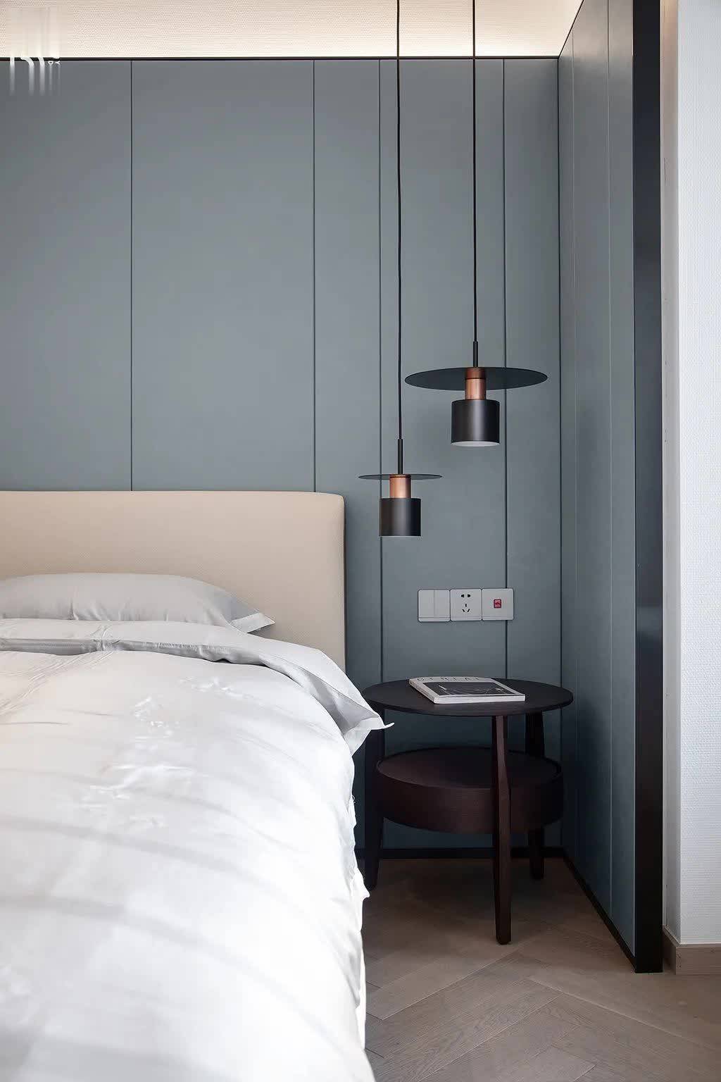 ▲侧边圆形的深木色床头柜,上方装上黑色+金属质感的吊灯,也让角落空间显得更加端庄华丽而大气。