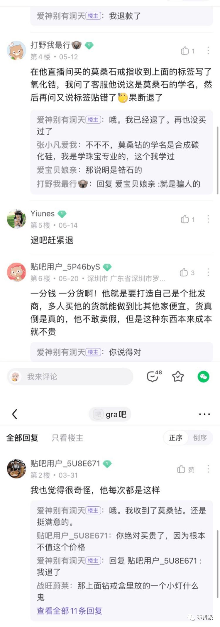 不仅卖的贵,带货派还注意到,在多个社交平台上,有不少消费者购买了董先生带货的珠宝后吐槽产品质量问题。一位贴吧网友发帖称:“200元抢到的莫桑钻有GRA证书,但是有种塑料的感觉。而且直播结束后小店就清空了,点进去主页粉丝才400个,退货地址是济宁”。