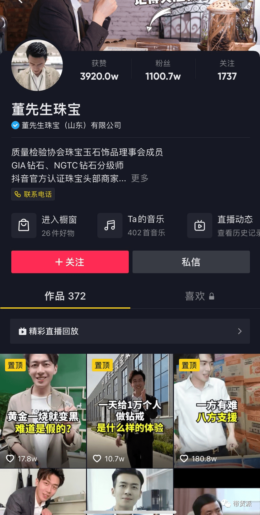正如其抖音号名称所示,董先生主要带货的品类是珠宝。带货派观察发现,“董先生珠宝”抖音粉丝1100.7万,在其抖音号主页中,董先生自称是质量检验协会珠宝玉石饰品理会的成员、GIA钻石、NGTC钻石专家分级师,珠宝资产评估宝玉石专家。