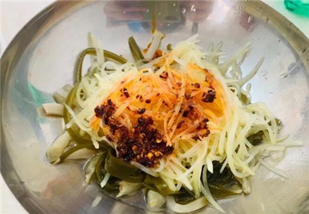 小菜拼盘,看上去清爽干净,土豆丝、海带丝和疙瘩丝味道都不错,也可以依据自己口味自己加辣椒、麻油和醋。