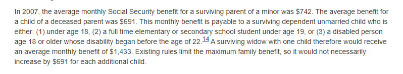 除了抚恤金,还有社会保障福利,给死者父母妻儿的。2007年那会儿,死者配偶有个未成年的孩子的,每月给742美金,孩子是给每个月691美金,直到孩子成年,都是给这笔保障的。大体就是,有个美军士兵死了,他有社保,他的妻儿每个月能得到1433美金的保障。
