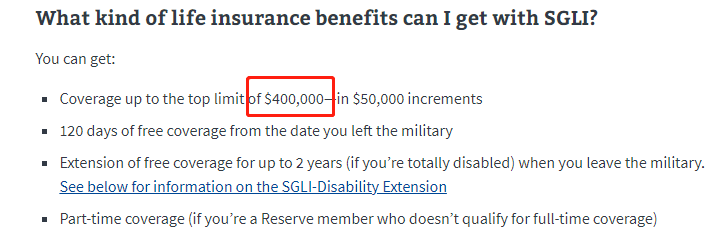 另外还有个服务人员团体人寿保险(Servicemembers’ Group Life Insurance),所有美军士兵,只要服役,就自动开始缴纳保险,不过这个可以不交。这个保险,最高保额是40万美金,只要美军认定了,能拿到那10万美金的,就可以拿到这份保险。