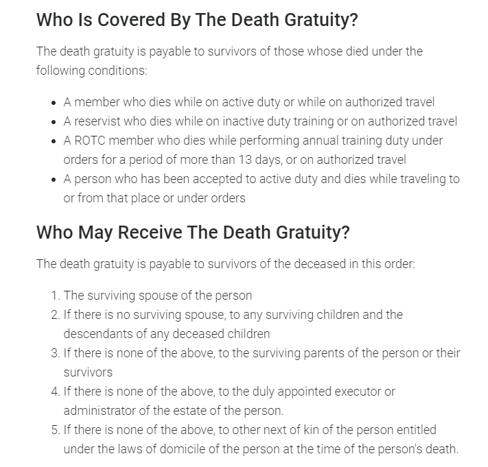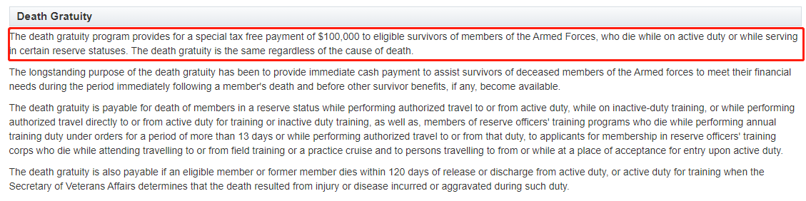 不光如此,一些士兵休假期间死亡的,退役之后死亡的,也可能会有这十万美金的一个赔偿。这个时限是120天,训练之后120天、退役120天的,如果这士兵死了,退伍军人事务部认定了,这人死亡原因和军队有关,比如退役前受伤之类的,这种美国政府也是需要支付这笔十万美金的赔偿金的。