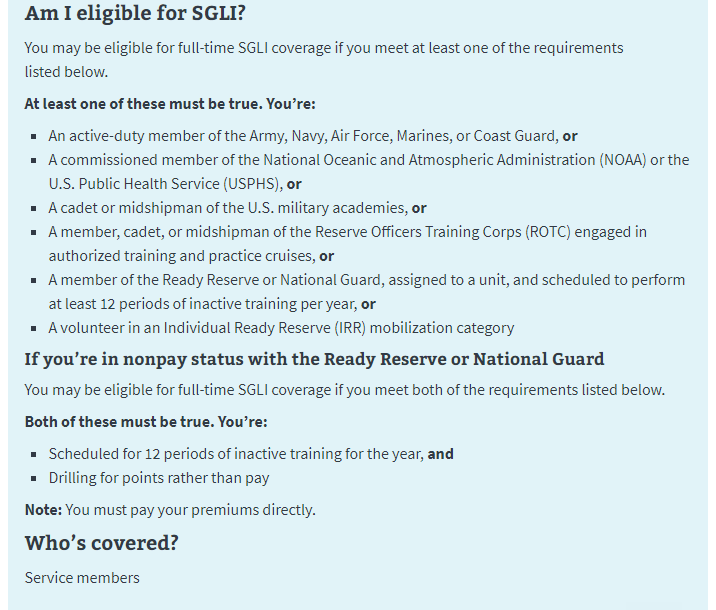 这份保险不光是死亡的有,残障的也有。而且,和美军的抚恤金规定一样,离开部队120天内,是免费承保的,认定是服役期间的原因导致死亡或者残障的,都可以获得赔偿。而且,如果是残障人士,退役之后还有两年的免费承保。这个保险里,甚至还包含现在的新冠病毒。