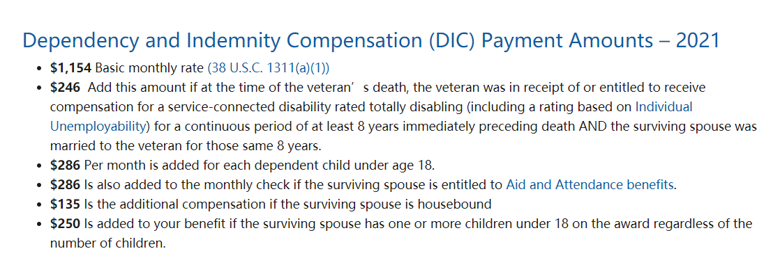 另外退伍军人死亡,因公导致退伍后死亡,退伍军人事务部还有一笔抚养费和赔偿金(Dependency and Indemnity Compensation),这是支付给美军死亡士兵的配偶、子女和父母的。如果是因为服役期间导致生病,后遗症什么问题,最终死亡,家属都是可以获得赔偿金和抚养费的。目前,每个家庭能够领取每个月1154美金的保障,有子女有配偶,都可以领取,并且还有各类加钱的条件。
