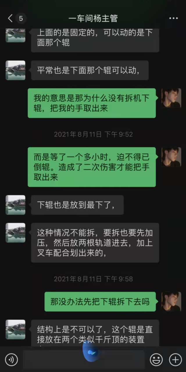 在2月19日,小鹏上岗时, 右掌被卷入机器被压一个多小时。当天原本有一个组长帮助他,不一会组长有事情走了,只剩他一个人看管机器,后来意外不幸发生了,他的手被卷进了机器。机器一直存在着安全故障,如果有人不幸被卷进去,机器也不会自动停止,小鹏大喊救命,有人听到才把机器人给停了下来。小鹏的手受伤严重,手背和手心的皮都被脱到了中指的第二关节,整个手像脱手套一样脱到了手指的第二关节,食指只剩了一节,中指只保到了一节的一半,无名指保住了但是没办法区分。但是在小鹏的手被绞入滚子后,公司为保护机器没有直接拆滚子,也没有叫消防队,自主用了些润滑油,想把手慢慢地滑出来,结果因为手卡的太进去了,根本拔不出来,他们可以拆机器但是并没有拆,因为机器比较贵重,价值百万元以上,最后他们将机器倒转,对小鹏的手进行了二次伤害,才将手拿出来,过程将近一个小时,小鹏的手都被死死地卷在机器里,可想而知这是怎样的疼痛,事后小鹏被送往了医院接受治疗。