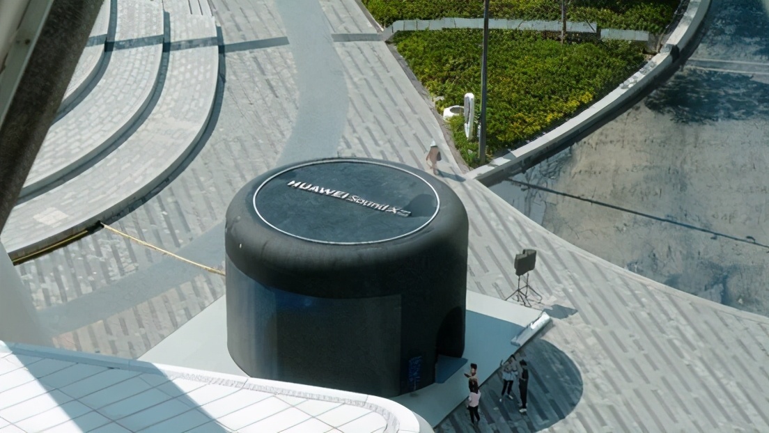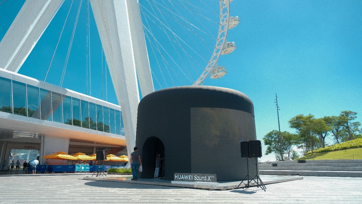 新一代HUAWEI Sound X音乐潮玩空间外观就是一个巨型音箱模样,在前海湾标志性的摩天轮旁边,再加上新一代HUAWEISound X独特的外观,可以说是相当吸人眼球了。