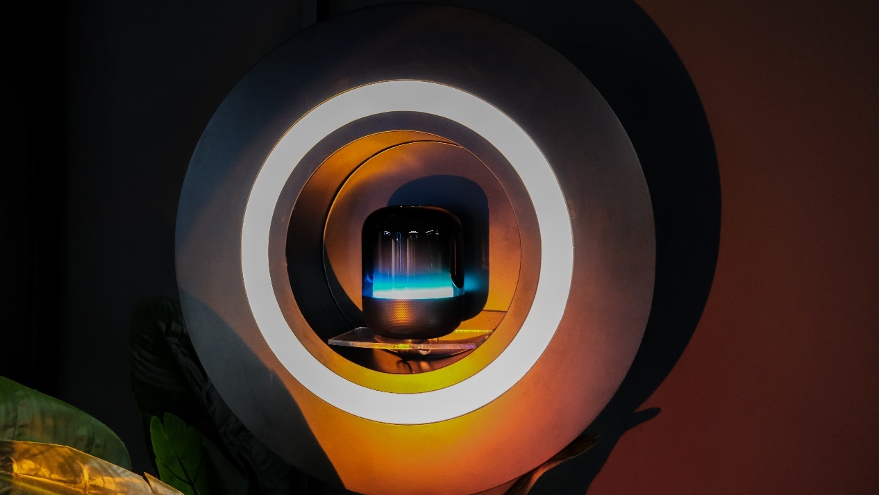 进入潮玩空间后,就可以看到里面有五个区域,最显眼的就是正面的智慧屏和整整八个新一代HUAWEI Sound X音箱,底座和音箱本身的颜色是相互对应的。这也是新一代HUAWEI Sound X的一大特点,丰富的RGB灯效,操控灯光也相当简单,轻拍熄灯,轻点就可以切换灯效。放在家中,除了能带来极致的音响效果,还是很棒的装饰物。